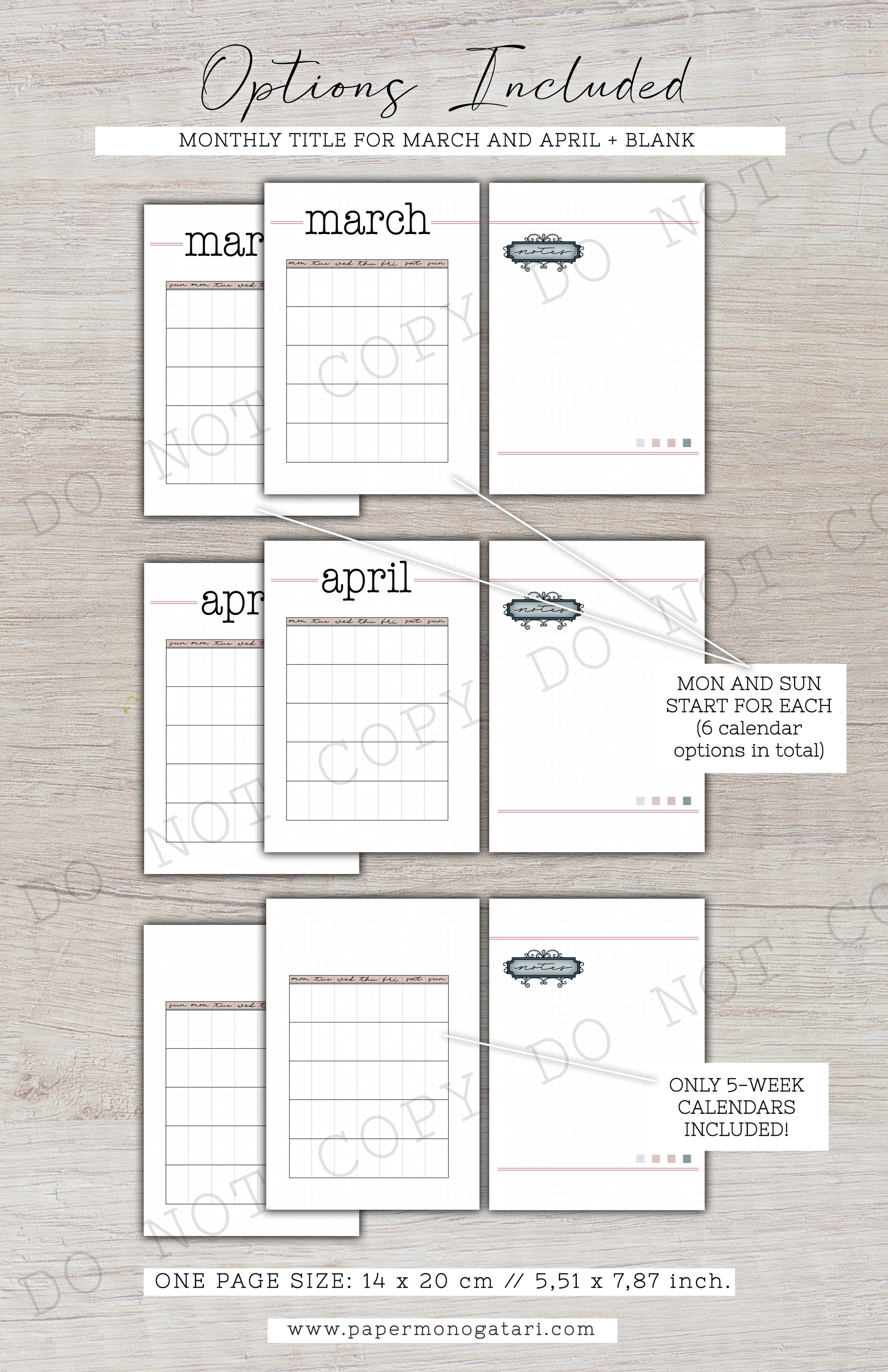 • Undated Setup with March and April Titles (with Mon and Sun start), a total of 18 JPG pictures
