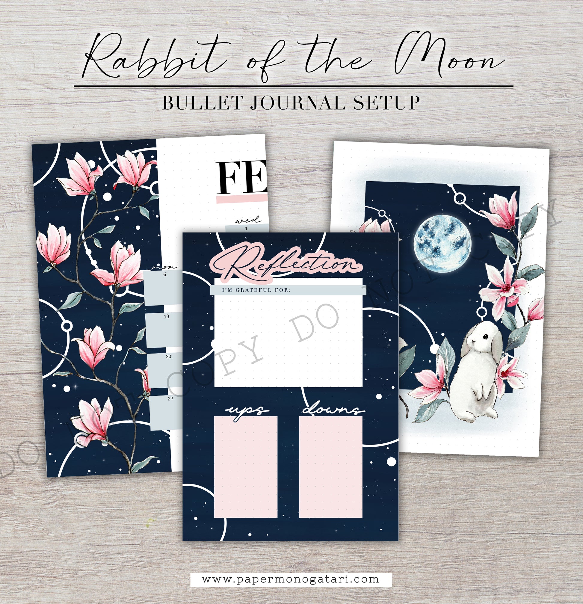 This bullet journal setup is inspired by the lunar year of the rabbit and combined with some celestial and magnolia decorations.