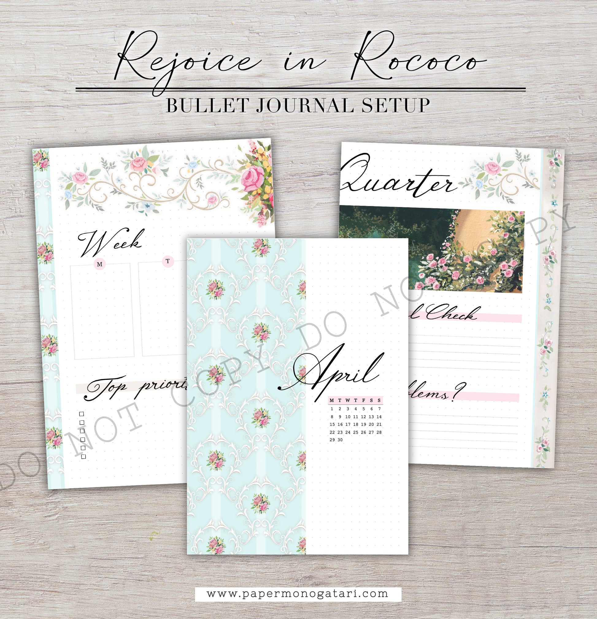 This is a Rococo-era-inspired bullet journal setup with light springy colors and floral decor.